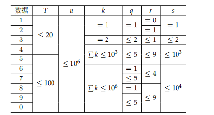 对于所有数据点,T,n,k,q,s均为正整数,$0\le r\le 9$,且 $\sum{q} \le 100$。