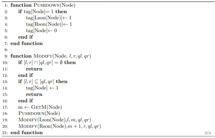 线段树的核心是懒标记,下面是一个带懒标记的广义线段树的伪代码,其中 tag 数组为懒标记: