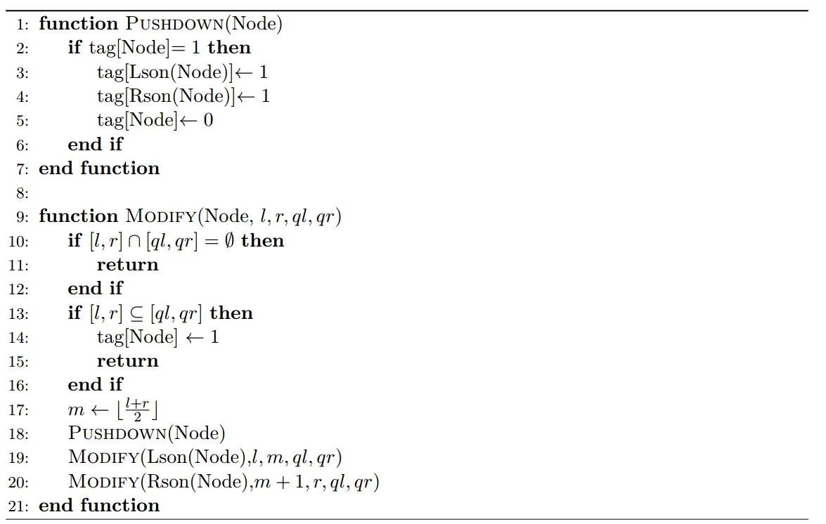 线段树的核心是懒标记,下面是一个带懒标记的线段树的伪代码,其中 $tag$ 数组为懒标记: